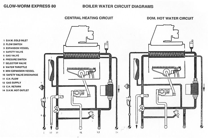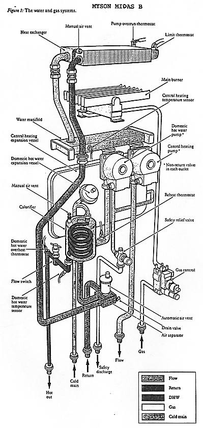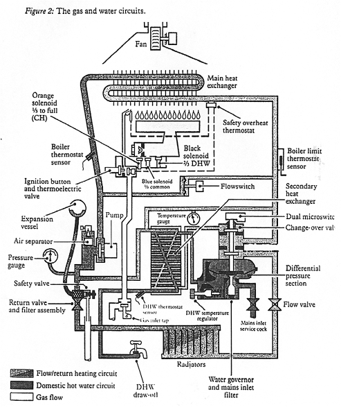 The operation of the domestic hot water tap causes the main burner to light and heat the water in the main heat exchanger and transfer its heat to the domestic hot water without the need for the use of either a pump on a second heat exchanger (Calorifier).